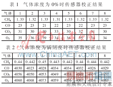 在气体浓度为0%及满刻度时测试采样值8次,结果如表1和表2。