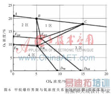 4 区:失爆区(氧气和甲烷浓度都过低不爆区),掺入空气可进入2区不爆,掺入甲烷可进入3区不爆。