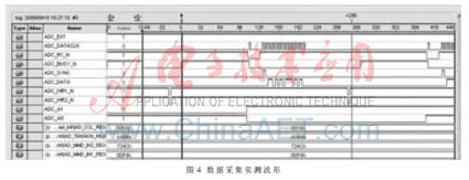 AD974在板卡上电后用Quartus II SignalTap实时观测的时序如图4所示。其中ADC_A0和ADC_A1为A/D4个通道地址编码信号,ADC_WR0_N和ADC_WR1_N为地址锁存信号,低电平有效,当前锁存地址作为下一次采集通道有效地址。当ADC_RC_N信号置为低电平时A/D开始将采集到的模拟信号向数字信号转换,并在此时送出一个时钟周期的ADC_DATACLK信号,使能A/D同步信号,此时如果A/D空闲则ADC_BUSY_N信号自动拉低,表示A/D已经开始转换数据,随后将ADC_RC_N置高并送出采样时钟信号,便可在ADC_DATA上开始读前一次转换完成的数据。当本次A/D数据转换完成后ADC_BUSY_N信号将自动置高,表明A/D本次转换完成,进入下一次模拟信号采样。