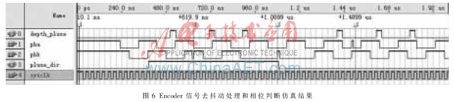 FPGA中对Encoder脉冲信号的去抖动处理和相位判断设计电路见图5,其中depth_pluse为去抖动后的脉冲信号,结合depth_dir完成脉冲计数,当depth_dir为正时,计数脉冲自加,depth_dir为负时,脉冲计数自减。本文用QUARTUS软件自带仿真工具对Encoder信号做的仿真波形,见图6,如波形所示,在时间节点619.9 ns、1.069 9 μs和1.489 9