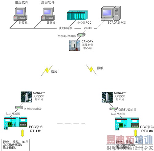 该系统由多个分布于城市各处的污水泵站和数据中心构成,各个泵站及数据中心站均布置了PCC进行现场的数据采集和数据存储,系统依靠灵活的网络通信方式,将各个泵站的液位,油温、油压及其他传感器的信息实时地传送到中心站,并且中心站可以实时、可靠的对泵站设备进行操控。系统结构图如下所示: