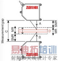 在被测体上方和下方各安装一个激光位移传感器,被测体厚度D=C-(A+B)。其中,C是两个传感器之间距离,A是上面传感器到被测体之间距离,B是下面传感器到被测体之间距离。图中:SMR是指传感器量程起始间距,MR是指传感器量程。