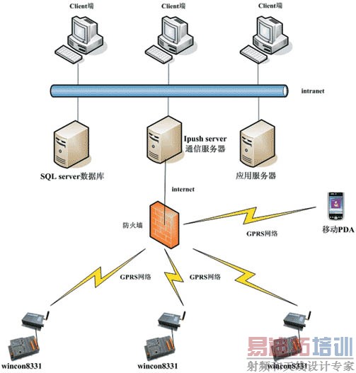 Wincon8331通过RS-232口与赫立讯的GPRS模块连接,通过内部的拨号程序拨入internet。由于Wincon8331提供一个10/100M网络接口,将来在系统拓展的时候,将采用wincon8331的网口与GPRS路由器连接的方式来接入internet,并由GPRS路由器来保证网络的畅通,让wincon8331更专注与数据采集与运算。