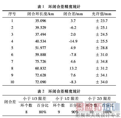 在此次水准测量过程中,采用了“后前前后”的测量模式,测站最大偏差值设为 0.4 mm,水准测量路线大多为车辆行人非常多的柏油公路和水泥路,路线总长 546 km;测量时间为上午 8 时至 12 时和下午 14 时至 18 时。环线闭合差精度统计如下表 1 和表 2。