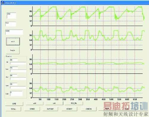 本系统主要完成将智能车行驶过程中的各种状态信息(如传感器亮灭,车速,舵机转角,电池电量等)实时地以无线串行通信方式发送至上位机处理,并绘制各部分状态值关于时间的曲线。有了这些曲线就不难看出智能车在赛道各个位置的状态,各种控制参数的优劣便一目了然了。尤为重要的是对于电机控制PID参数的选取,通过速度—时间曲线可以很容易发现各套PID参数之间的差异。对于采用CCD 传感器的队伍来说,该系统便成为了调试者的眼睛,可以见智能车之所见,相信对编写循线算法有很大帮助。而且还可以对这些数据作进一步处理,例如求取一阶导数,以得到更多的信息。
