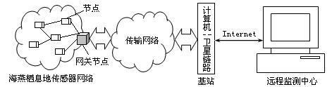 传感器网络在生态环境监测方面的应用非常典型。美国加州大学伯克利分校计算机系Intel实验室和大西洋学院(The College of the Atlantic, COA)联合开展了一个名为 “in-situ”的利用传感器网络监控海岛生态环境的项目。该研究组在大鸭岛(Great Duck Island)上部署了由43个传感器节点组成的传感器网络,节点上安装有多种传感器以监测海岛上不同类型的数据。如使用光敏传感器、数字温湿度传感器和压力传感器监测海燕地下巢穴的微观环境;使用低能耗的被动红外传感器监测巢穴的使用情况,系统的结构框图如图3所示。