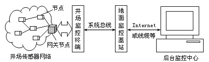 矿井利用无线传感器网络实现井下安全监控的系统结构框图如图2所示。传感器节点负责井下多点数据采集,主要包括CO、 、 、瓦斯、风速和气压等参数,通过井场监控终端(基站)和地面基站传送给后台监控中心。后台监护人员通过该监测系统可及时、有效、全面的掌握矿井情况,有利于矿井实施指挥调度、安全监测,从而可以有效的防止矿井事故的发生。