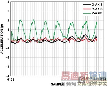 图3. 从一名跑步者测得的x、y和z轴加速度的典型图样