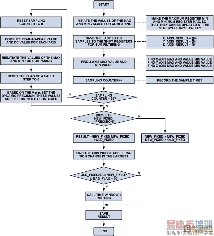 此算法使用50 Hz数据速率(20 ms)。采用interval的寄存器记录两步之间的数据更新次数。如果间隔值在10与100之间,则说明两步之间的时间在有效窗口之内;否则,时间间隔在时间窗口之外,步伐无效。