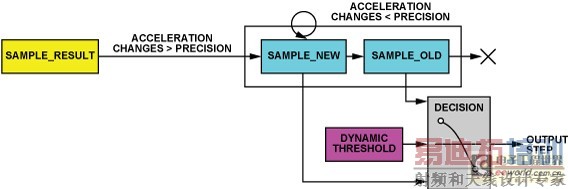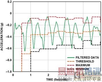 动态阈值和动态精度:系统持续更新3轴加速度的最大值和最小值,每采样50次更新一次。平均值(Max + Min)/2称为“动态阈值”。接下来的50次采样利用此阈值判断个体是否迈出步伐。由于此阈值每50次采样更新一次,因此它是动态的。这种选择具有自适应性,并且足够快。除动态阈值外,还利用动态精度来执行进一步滤波,如图6所示。