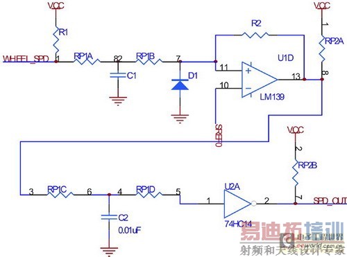 电路采用两级滤波和整形,以保证轮速信号在极低转速下不会丢失,同时避免因悬架振动引起的信号干扰。图中由电阻R2引入第一级迟滞比较,而使用74HC14引入第二级迟滞比较。