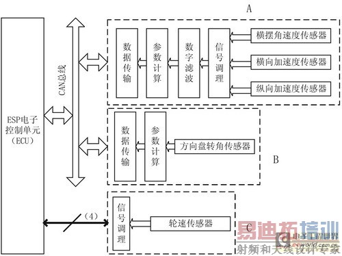 本文所作设计的框图如图4所示。在图中,方向盘转角传感器信号经微控制器处理后,通过CAN总线发送给ECU(图4中B);横摆角速度传感器、纵向/横向传感器由于信号特点和安装位置类似,故设计在同一个模块内(图4中A);由于ESP对轮速传感器信号的实时性要求较高,故经过信号调理后,直接送入ECU(图4中C)。在图4的A和B中,需要微处理器对信号进行处理并通过CAN总线传送数据,本文选用Infineon公司的SAK-C164CI。该芯片是专为汽车应用而设计,内置AD转换器、输入信号捕捉、正交解码器,运算速度快,非常适合ESP的传感器信号处理。