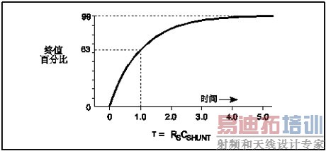因此,读数稳定至最终值的1%所需的建立时间为τ的5倍,也就是50秒。图7所示为RC电路的阶跃电压指数响应。经过一个时间常数(τ = RC)后,电压上升至最终值的63%。