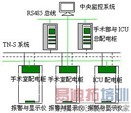 图中各个手术室和重症监护室分别采用独立的IT供电系统,所有的IT系统由手术部与ICU总配电柜通过TN-S系统配电。各IT系统的绝缘监测器及总配电柜内的剩余电流监测设备又通过基于Modbus协议的RS485总线将各个监测信号反馈到手术部的中央监控室内,并由中央控制室的上位机通过中央控制系统软件进行集中监控。各个IT系统与TN-S系统的运行状态,都可以显示在中央监控室的上位机上,方便工作人员对系统进行集中监控与管理。