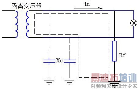 在正常情况下,系统中仅存在线路对地电容的微小泄漏电流。图1所示为IT系统发生第一次接地故障示意图,当系统发生第一次单相接地故障时,故障电流为两非故障相对地电容电流的相量和Id ,由于这个电流值甚小,不会造成人身电击或者其它事故,也不会切断电源,保证了系统供电的连续性。但是如果不及时排除故障,当第二次另一相发生接地故障时,相当于形成相间短路,使过电流保护装置动作,引起供电的中断,这对于重要的供电场所来说,是不允许的。