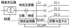 由上面的分析可知,一个典型的单相IT系统,其组成设备主要包括:隔离变压器、绝缘监测器、电流互感器,以及外接报警与显示仪,见图2。