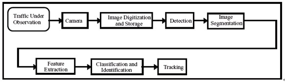 视频交通信息采集系统的摄像机对车辆进行拍摄,将拍摄到的图像进行存储并数字化,对图像初步处理,去掉多余信息;接着对图像进行分区;按一定算法对各分区图像处理,提取特征信息;根据特征信息进行车辆记数、分类。根据相邻图片计算车速;最后在拍摄区域内跟踪所辨识出的车辆。