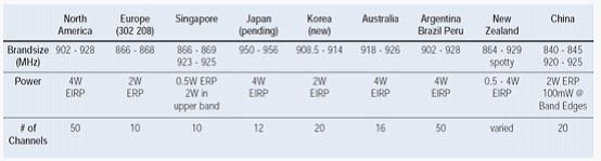 图2:EPC Class1 G2的900MHz UHF 频段范围在各国的分配情况不一。