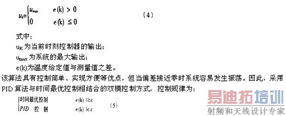 可以规定一阈值ε,当偏差大于ε时,实行时间最优控制,而在阈值以内,实行PID控制。这样,既可以发挥Bang-Bang控制快速消除大偏差的优点,又能发挥PID控制精度高,超调小的优点,从而使温度控制过程的静态、动态性能指标较为理想。