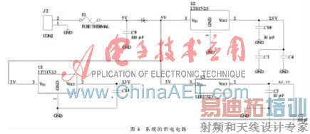 由于其系统电压为2.5 V,而串口MAX3232等外设的电压为3.3 V,AD590等的工作电压为5 V,因此系统采用了如图4所示的供电电路。