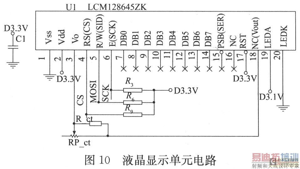 因此,本文中LCM128645ZK型中文液晶显示模块工作于串行总线方式。DSP使用SPI通讯接口与LCM128645ZK进行通讯,发送相关的控制指令和数据,控制液晶模块执行相应的操作,显示相关的数据。液晶显示单元的硬件电路如图10所示。