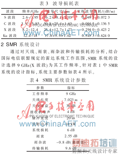 本文从天线尺寸、雨衰、雨杂波及传输损耗四个方面分析了SMR工作频率对系统设计的影响。由于SMR工作于低频率波段时的雨衰较小,不必为降雨环境设计更强的发射功率,且雨杂波较弱,有利于目标的检测,不容易出现漏警和虚警。另外,低频率波段时SMR的传输损耗较小,发射/接收单元不必紧靠天线,可以采取更灵活的安装方式。最后根据频率分析的结果,给出了X波段SMR系统设计的主要参数。