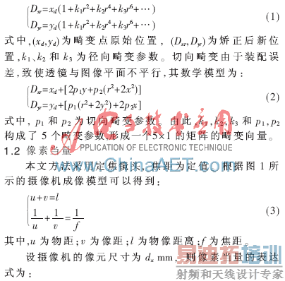 实际摄像机的透镜总是在成像仪的边缘位置产生显著的畸变,畸变主要分为径向畸变和切向畸变两种。径向畸变来自于透镜形状的设计,而切向畸变来自于整个摄像机的组装过程中[4]。针对径向畸变,成像仪中心的畸变为0,随着向边缘移动,畸变越来越重,成像仪某点的径向位置可按下式进行调节:
