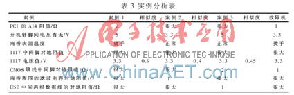 由上文给出的案例表示以及案例相似度的计算方法,在案例库中选取3个典型主板故障案例作为检索案例,选取1个已经发生的主板故障作为故障机,假设在具体原因未知的情况下, 根据故障主板测量值与选取的3个案例进行比较,以此来检验系统的检索机制,见表3。