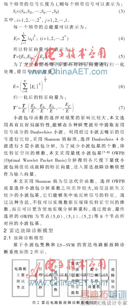 摘 要: 针对雷达电路板检修困难的问题,提出了基于最优小波包基和最小二乘支持向量机相结合的雷达电路板故障诊断方法。利用小波变换对采样数据进行去噪处理,通过小波包分解选择最优小波包基提取熵值作为故障特征向量,并作为基于最小二乘支持向量机的雷达故障诊断模型的输入向量,经诊断模型输出后,完成雷达电路板故障诊断。基于此方法设计了雷达电路板故障诊断系统,提高了雷达故障诊断的正确性和效率。