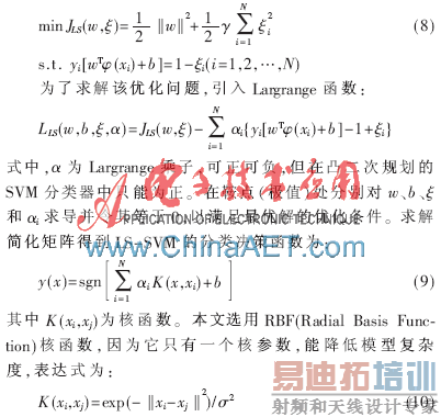 支持向量机[3]SVM(Support Vector Machine)是在统计学习理论SLT(Statistical Learning Theory)的基础上发展起来的十分有效的分类方法,它基于最小的结构风险,解决了学习机的学习能力和泛化能力之间的矛盾。支持向量机通过核函数把原始数据空间映射到高维的特征空间,在特征空间最大化分类间隔构造最优分类超平面,其中分类面只需要少量的支持向量。SVM克服了神经网络的不足,在解决小样本、非线性及高维模式识别问题中表现出结构简单、全局最优、泛化能力强等许多特有的优势。最小二乘支持向量机[4,5]LS-SVM(Least Squares Support Vector Machine)是SVM的扩展,采用最小二乘线性系统代替SVM用二次规划的方法实现学习问题,避免了SVM的凸二次规划问题的求解。
