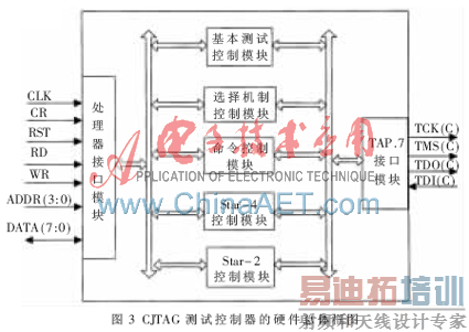 根据CJTAG测试控制器的功能需求,将此控制器的设计分为五个子模块和一个顶层模块。五个子模块分别为基本测试控制模块、选择机制控制模块、命令控制模块、Star-4控制模块和Star-2控制模块,分别实现了CJTAG的T0、T1、T3和T4层的功能。顶层模块包括处理器接口模块和TAP.7接口模块,作为该控制器连接PC机和待测芯片的桥梁。具体硬件总体框图如图3所示。