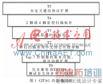 IEEE1149.7标准以IEEE 1149.1-2001边界扫描标准为基础,提供可升级的测试方法满足集成电路种类繁多及功能复杂的需要,从功能上划分为T0~T5六层[7],每一层都在它上一层的基础上增加新的功能,如图1所示。