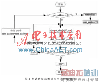 Shift-xR状态测试数据或测试指令传输的操作流程如图4所示,图中ram_address为缓冲器地址,ram_reload表明装载缓冲器,test_data为测试数据或测试指令,shift_cnt为移位计数器。据此设计一个8×8的测试缓冲器,通过测试数据管脚并行接收PC机的测试数据或测试指令,在数据传输过程中通过TDO串行输出。