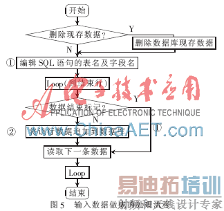 输入数据做成即是将设计的测试数据追加到数据库中,图2的数据包含描述性文字(执行前、执行后)、表名、字段名、字段值及数据结束标志(*****END*****),数据结束标志用于标识某数据表数据结束。利用这些数据可以提取出需要更新的表名、字段名及数据。利用图4所示工具,建立数据库连接、指定工作表及向数据库追加数据的开始和结束行号,功能选项设为“数据插入”。单击执行按钮的处理流程如图5所示。图中,“删除现存数据”复选按钮用于选择更新数据前是否删除数据库中现存的数据,若选择删除现存数据,则需要读取数据库中所有用户表名,逐一删除后再向数据库追加数据;过程①实现读取工作表中的表名及字段名,形成INSERT语句到VALUES为止的前半部分SQL语句,当遇到数据结束标志时,再次调用过程①重置SQL语句的前半部分;过程②实现读取该行单元格数据,并将数据拼接到过程①形成的SQL语句,拼接完成则执行该语句,实现数据向数据库的追加。