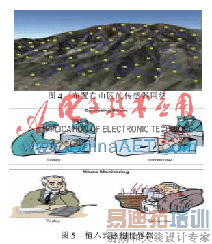 图4[17]是布置在山区无人地带用来执行监测任务的无线传感器网络。而图5[17]中则用对比的方法来使人们一目了然地了解无线供电的好处。