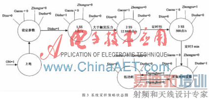 参考文献[4]中提出了采样策略。采样策略就是对测试系统采样过程的控制,使之适合被测对象的运动规律,完整准确地记录和复现被测对象的动态过程[4]。香农采样定理要求,采样频率fc≥2 fs,其中fs是信号的最高频率分量。工程应用中常常采用fc≥10fs。石油井下压力测试仪采样过程分为几个阶段:下井阶段、射孔阶段、压力恢复阶段。系统采用两片MSP4301611单片机芯片来实现采样策略功能,两片单片机分为主、从单片机,主单片机作为控制芯片,控制各个采样状态之间的变换,并负责数据的存储, 从单片机主要负责压力信号的采集。图3是系统采样策略状态图。