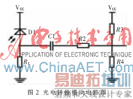 外触发采用光触发技术,炸弹爆炸时的闪光信号通过光电转换电路触发系统。光电转换电路的光电器件选择2DU型硅功率光敏二极管,将光信号转换成电信号,结合外围电路组成光电转换电路。光电转换电路如图2所示。