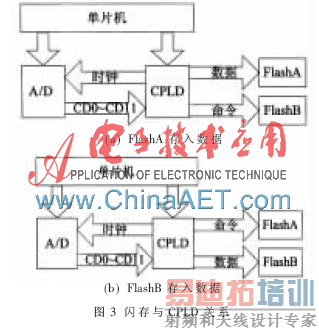 由于闪存存在较长的页编程时间,编程时无法对其进行操作,为了在高速数据转换情况下不丢失数据,并进一步提高存储容量,采用两片闪存芯片交替工作组成数据存储器,总存储容量扩大为1 GB。