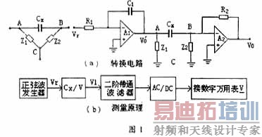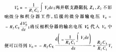 根据微分积分电路性质,可将电容的测量转换成电压测量。测量原理和转换电路图如图1。