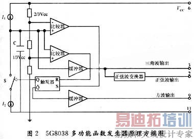 由5G8038构成的函数发生器原理框图可知:他由1个恒流充放电振荡电路和1个正弦波变换器组成,恒流充放电振荡电路产生方波和三角波,三角波经正弦波变换器输出正弦波。图中2个比较器C1,C2组成1个参考电压分别设置在2/3Vcc和1/3Vcc上的窗口比较强。2个比较器的输出分别控制RS触发器的置位端和复位端。2个恒流源I1,I2担任对定时电容C的充放电,而充电和放电的转换则为RS触发器的输出通过电子开关S的通或断来进行控制。当电子开关S断开时,电路对外接电容C充电,当电子开关S接通时,电容C放电,所以,若电路参数设计恰当,可在电容C上产生良好的三角波,经缓冲器由3脚输出。为了得到在比较宽的频率范围内三角波到正弦波的转换,可用1个由电阻和晶体管组成的折线近似转换网络将三角波转换为正弦波,由2脚输出。而用于控制开关S的信号,即RS触发器的输出,就是方波,经缓冲器由9脚输出。