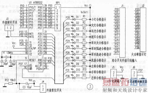 汽车组合开关是汽车中常用的一种开关(外形见图1所示),有近光、远光、小灯、大灯、超车、雨刮高速、雨刮低速、雨刮间歇、洗涤、左转、右转等挡位。目前许多生产厂家在检测组合开关时仍采用传统的模拟测试方式。这种方式容易造成个别挡位漏检和错检,检测效率也低。为此笔者制作了一种基于AT89S52的汽车组合开关检测装置,该装置可以对组合开关的所有挡位进行精确检测,设置有声、光报警功能,有效防止了模拟测试中的错检和个别挡位漏检现象。在此仅对该装置的电路部分剖析如下。