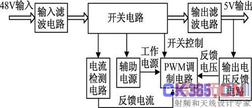 其中, 开关电路、输入滤波电路与输出滤波电路为主工作电路, PWM 调制电路作为整个模块的控制核心, 根据模块电源工作电流、输出电压反馈信号, 输出控制信号, 动态关断与导通开关管, 实现对输出的实时控制。