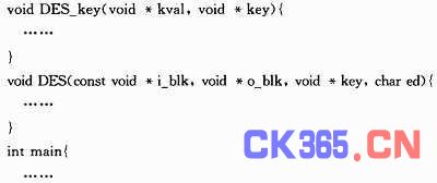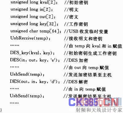 数据加密标准(DES)是著名的对称密钥分组密码,它由美国标准FIPS 46-2定义。基于ARM7指令系统,DES的C语言实现难度不大,但它是对IP核工作能力的一次综合检验。将DES算法分解为密钥生成算法和加解密算法,对应验证程序中两个子函数,其最终的代码实现框架如下: