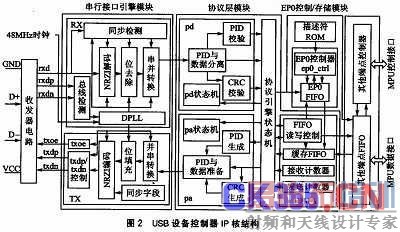 本文选用的USB设备控制器是课题组早期项目之一,它是由Opencores网站提供的初级开源版本改进而成,其结构如图2所示。IP核支持低速和全速模式,共有1个控制传输端点(EP0)、7个其他可配置端点,且缺少微处理器也能响应主机对设备的枚举。收发器电路主要完成模/数信号转换,即在OUT事物中将模拟信号D+和D-转换成串行接口引擎模块可识别的数字信号rxd、rxdp和rxdn,在IN事物中将数字信号txdp和txdn在使能信号txoe的控制下转换成模拟信号D+和D-;串行接口引擎模块主要完成收发包,根据传输方向可分为接收和发送,主要包括总线检测、同步检测、时钟恢复、不归零反向编码和解码、位填充及位去除、数据的串/并转换;协议层包括协议引擎态机、组包、解包、FIFO控制器;端点O控制器主要负责响应主机标准请求;描述符RAM存储了设备的各种描述符;其他端点控制器及FIFO提供了配置接口,目的是预留给开发者进行IP核移植。