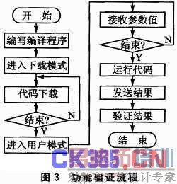 在完成前面的工作之后,借助FPGA对微处理器进行了功能验证。选用Altera公司DE2开发板作为硬件逻辑的实现载体,微处理器IP核工作时钟为开发板上27 MHz晶振输入,USB控制器IP核工作时钟为27 MHz晶振倍频至48 MHz。功能验证流程如图3所示,在主机上利用μVision 3.63编写、编译验证程序后,微处理器进入下载模式接收主机对设备的代码下载,之后进入用户模式接收主机端传送的验证程序参数值,在运行代码后将执行结果返回至主机,通过与主机软件模拟结果比较达到验证微处理器运行结果的目的。