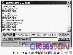 USB通信软件采用MFC编写,主要功能有:将.hex文件以十六进制的形式发送至USB接收USB返回的数据,并以十六进制的形式显示。采用DES程序标准测试向量,其中初始密钥K=1A624(289520DEC46,明文P=748502CD38451097,密文C=DDOCFEB783CF3FDE,在通信软件中代码下载及验证数据的收发如图4所示。按照上述原理,还编写了其他若干验证程序并下载至ROM中,微控制器的执行结果均正确。