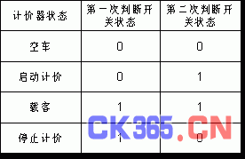 设计一个空载开关,开关闭合时读到低电平“0”,打开时读到高电平“1”,通过两次读取开关的数值,判断出租车所处的不同状态,如表二所示,两次读到“0” 说明出租车处于空车状态,两次都读到“1”说明出租车处于载客状态,第一次读到“0”第二次读到“1”出租车从空车变到载客,第一次读到“1”第二次读到 “0”出租车从载客变到空车。