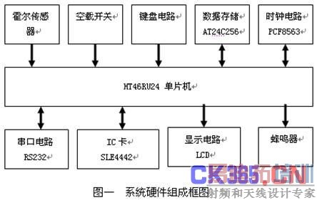 总体结构如图一所示。硬件上主要由HT46RU24单片机,霍尔传感器,空载开关,键盘电路,数据存储电路,时钟电路,显示电路,蜂鸣器,IC卡电路以及串口电路组成。