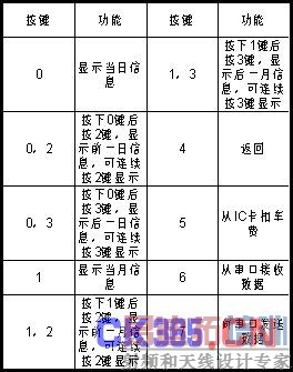 空车部分主要是做显示、PC机通信以及IC卡消费。通过设置程序实现按不同的按键完成不同的功能。例如按下“0”键,液晶屏会显示当日的统计信息,再按下“2”键会显示前一日的统计信息,按下“4”键显示后一日的统计信息,具体要完成的功能如表一所示。