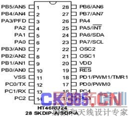 HALT和唤醒功能可降低功耗。HT46RU24单片机还可当I2C从机使用。管脚图如图二所示。